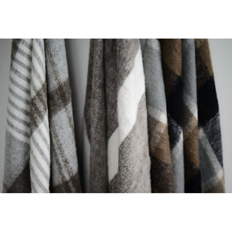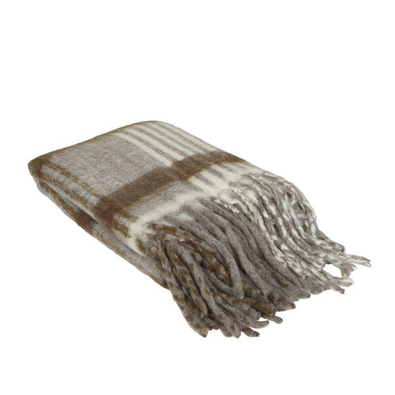 Nadýchaná a útulná prikrývka so širokými pruhmi a hrubými točenými strapcami pozdĺž okrajov, vyrobená z akrylu a vlny.
