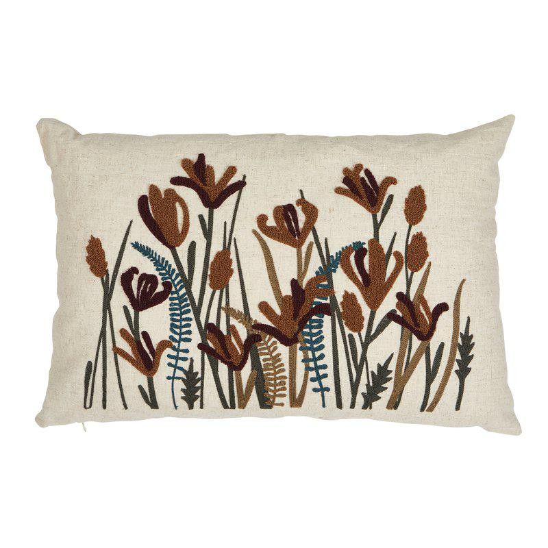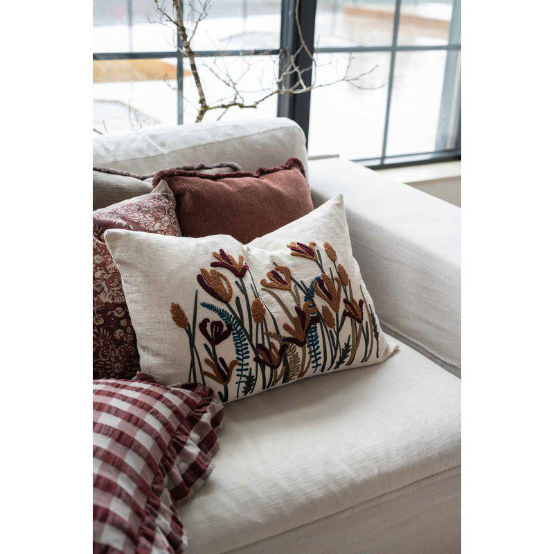 Poťah na vankúš zo zmesi bavlny a ľanu s ľanovým podkladom a vyšívaným vzorom, ktorý púta pozornosť svojou žiarivou textúrou.