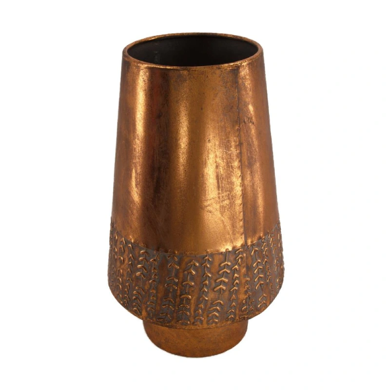 Zaujímavá plechová váza medenej farby s patinou a jemným motívom lístkov.